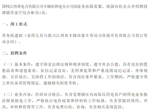 ->查看國網(wǎng)江西省電力有限公司豐城市供電分公司因業(yè)務(wù)拓展需要,現(xiàn)面向社會公開招聘段潭鎮(zhèn)營業(yè)廳綜合柜員1名:一、用工形式勞務(wù)派遣制(錄用人員與我司江西省豐城市惠豐勞動力資源開發(fā)有限公司簽訂勞動合同)。二、招聘條件(一)基本條件:遵守國家法律法規(guī)和規(guī)章制度,遵守社會公德,...