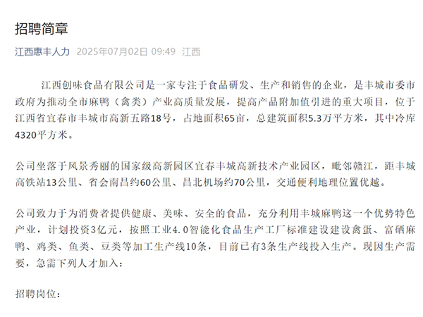 江西創(chuàng)味食品有限公司是一家專注于食品研發(fā)、生產(chǎn)和銷售的企業(yè),是豐城市委市政府為推動全市麻鴨(禽類)產(chǎn)業(yè)高質(zhì)量發(fā)展,提高產(chǎn)品附加值引進(jìn)的重大項目,位于江西省宜春市豐城市高新五路18號,占地面積65畝,總建筑面積5.3萬平方米,其中冷庫4320平方米。公司坐落于風(fēng)...
